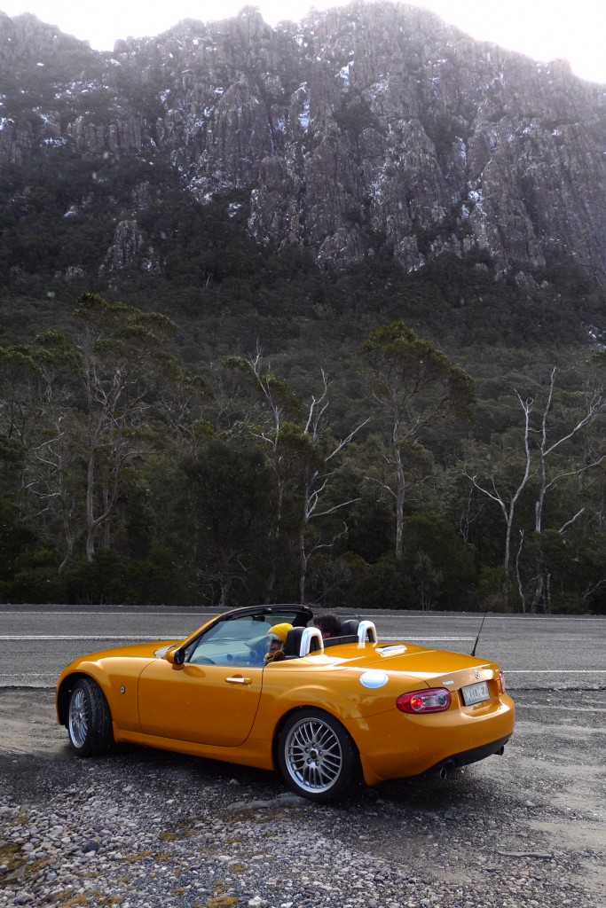Formalities over and the sun shining strongly, we headed out for some more of the great roads. The destination for the afternoon was up towards the Great Lake, not only for the road but also for the photo opportunities in the late afternoon sun. The road climbs quite steeply with numerous hair-pin corners interspersed with flowing left and right handers … it was MX-5 heaven until it started snowing.